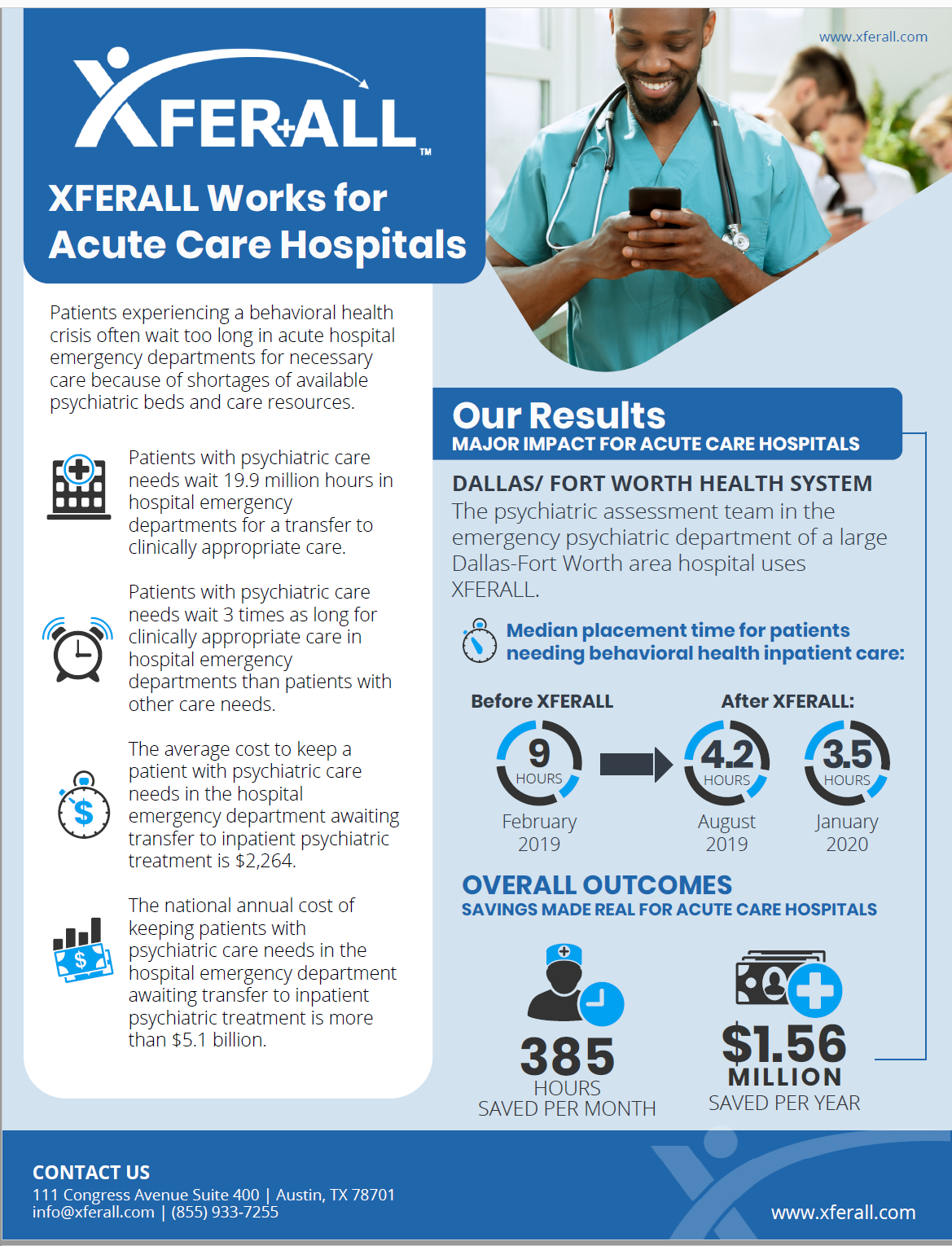 For all its partners, XFERALL has reduced the time from initial transfer request to inpatient acceptance for behavioral health patients by 86%.